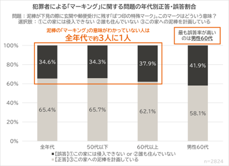 泥棒による「マーキング」や、窓の“防犯性能”を示す「マーク」などを問う設問、いずれも性年代問わず30%以上が誤答。