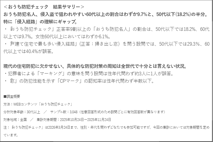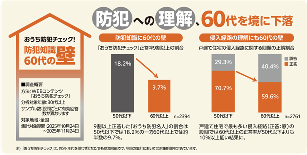 おうち防犯名人(正答率9割以上)の割合、60代以上はわずか9.7%と50代以下(18.2%)の約半分。特に「侵入経路」の理解にギャップ。