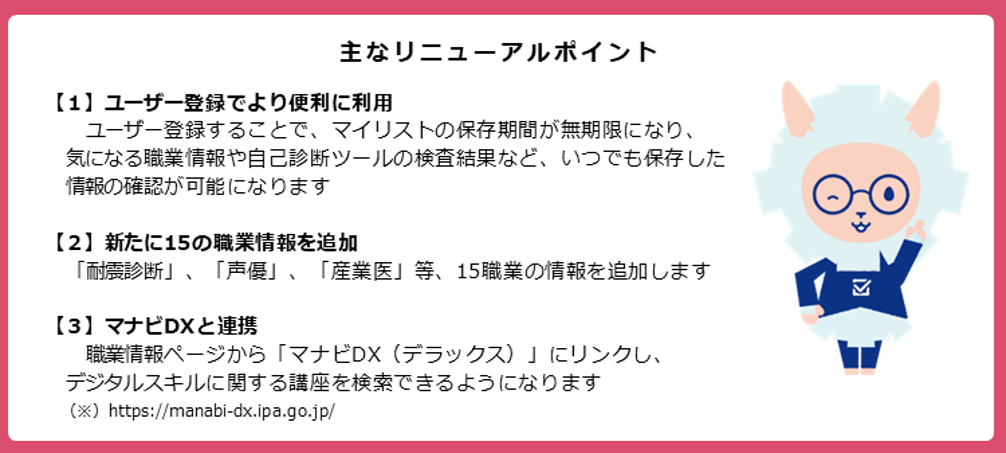 気になる職業情報や自己診断ツールの検査結果など、保存した情報の確認がいつでも可能になるユーザー登録機能の追加や、新たに15職業の職業情報を追加する等のリニューアルを、3月17日(火)に行いました。