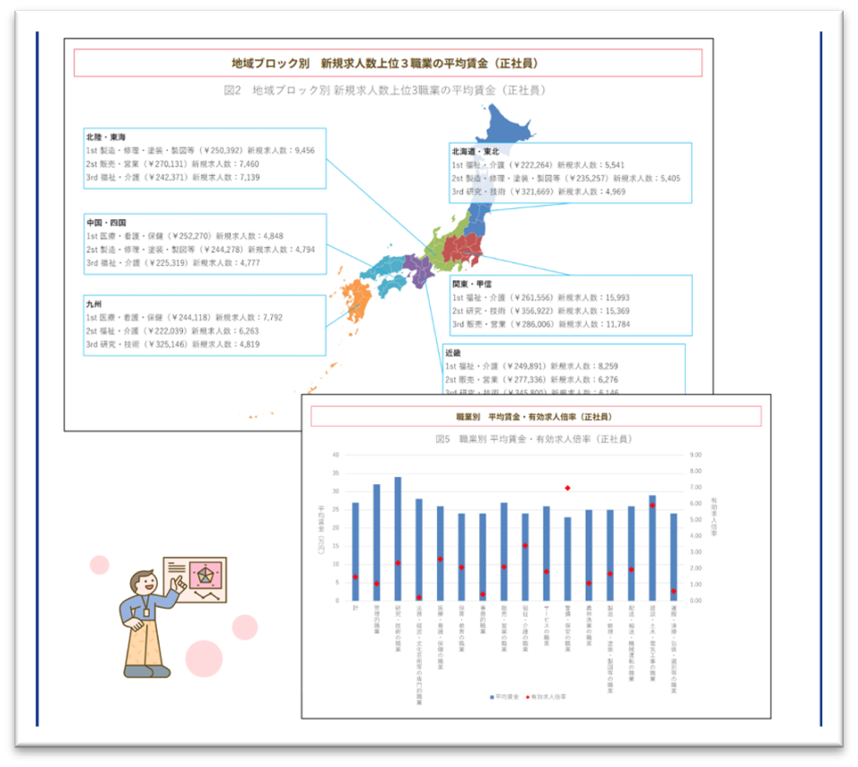 これにより、自分が考えていた職種や地域のデータに加えて、別の職種や近隣県等のデータを比べて見ることができ、就職の選択肢を広げるきっかけをつかむこともできます。