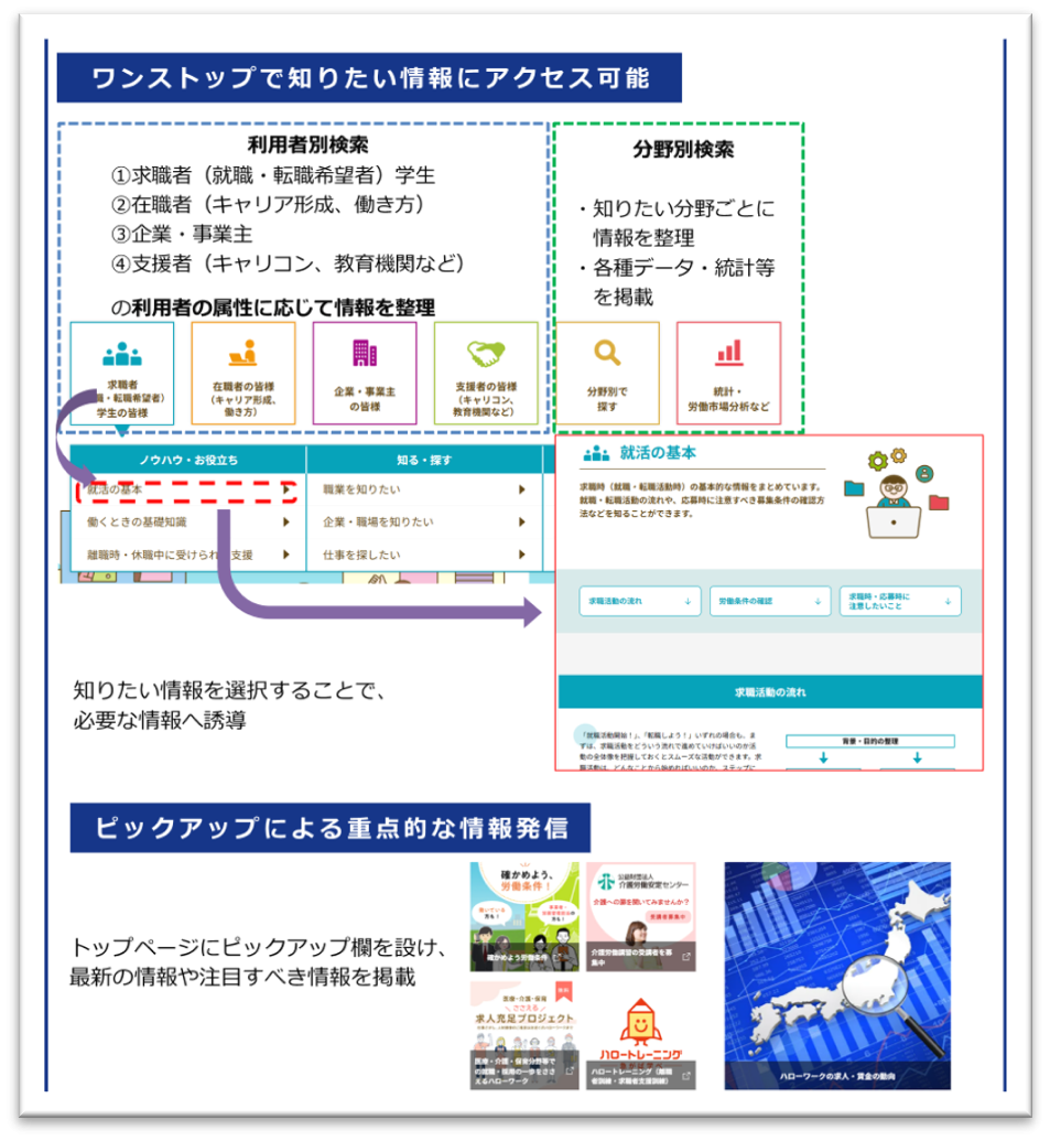 このサイトでは、職業や職場に関する情報、スキルアップの手がかりや労働関連法令など、働く方や企業、支援者の方に役立つ情報を、利用者別・分野別に探すことができます。