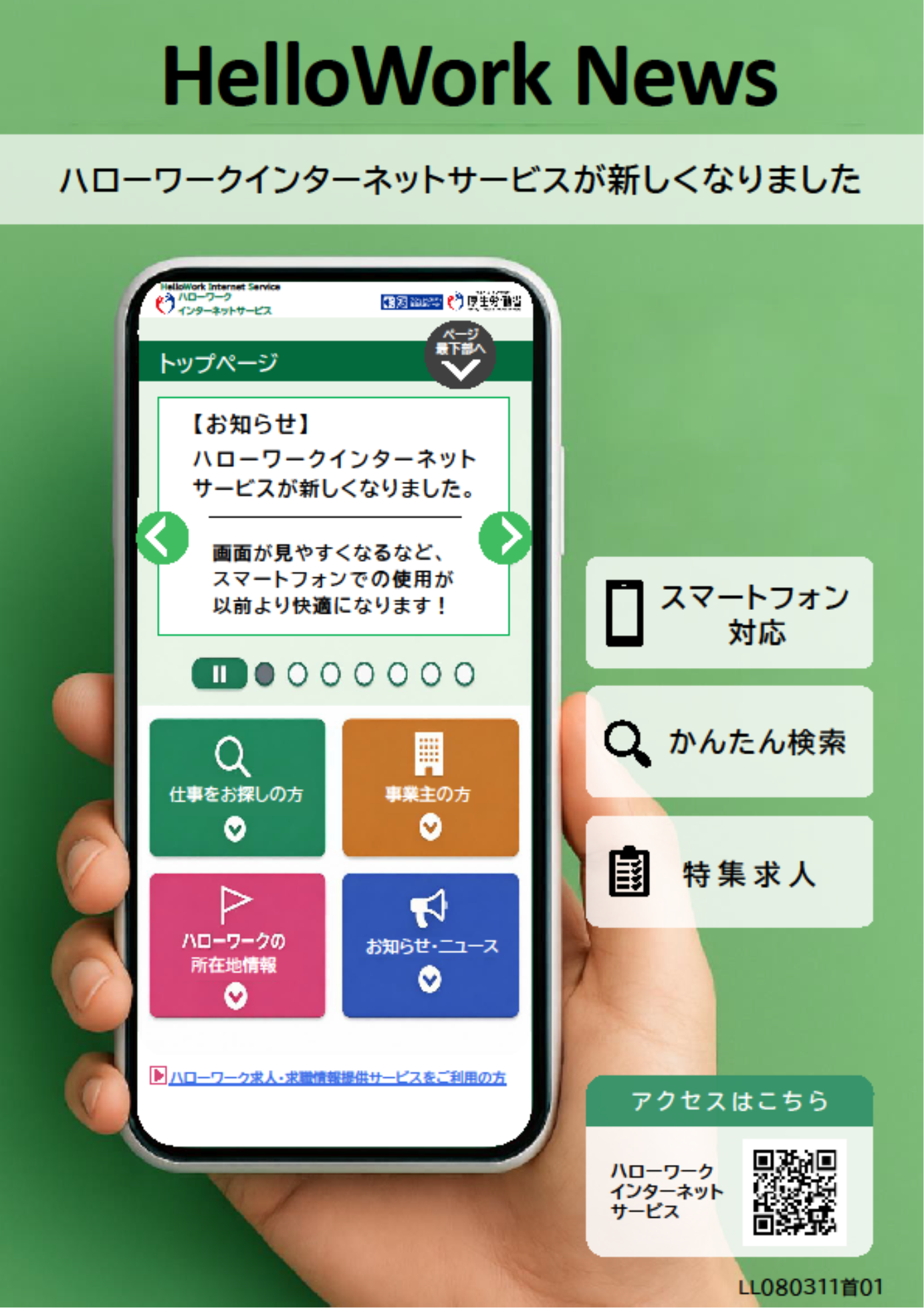 ハローワークインターネットサービスとは、お持ちのパソコンやスマートフォン等で全国のハローワークの求人を検索することができるオンラインサービスです。