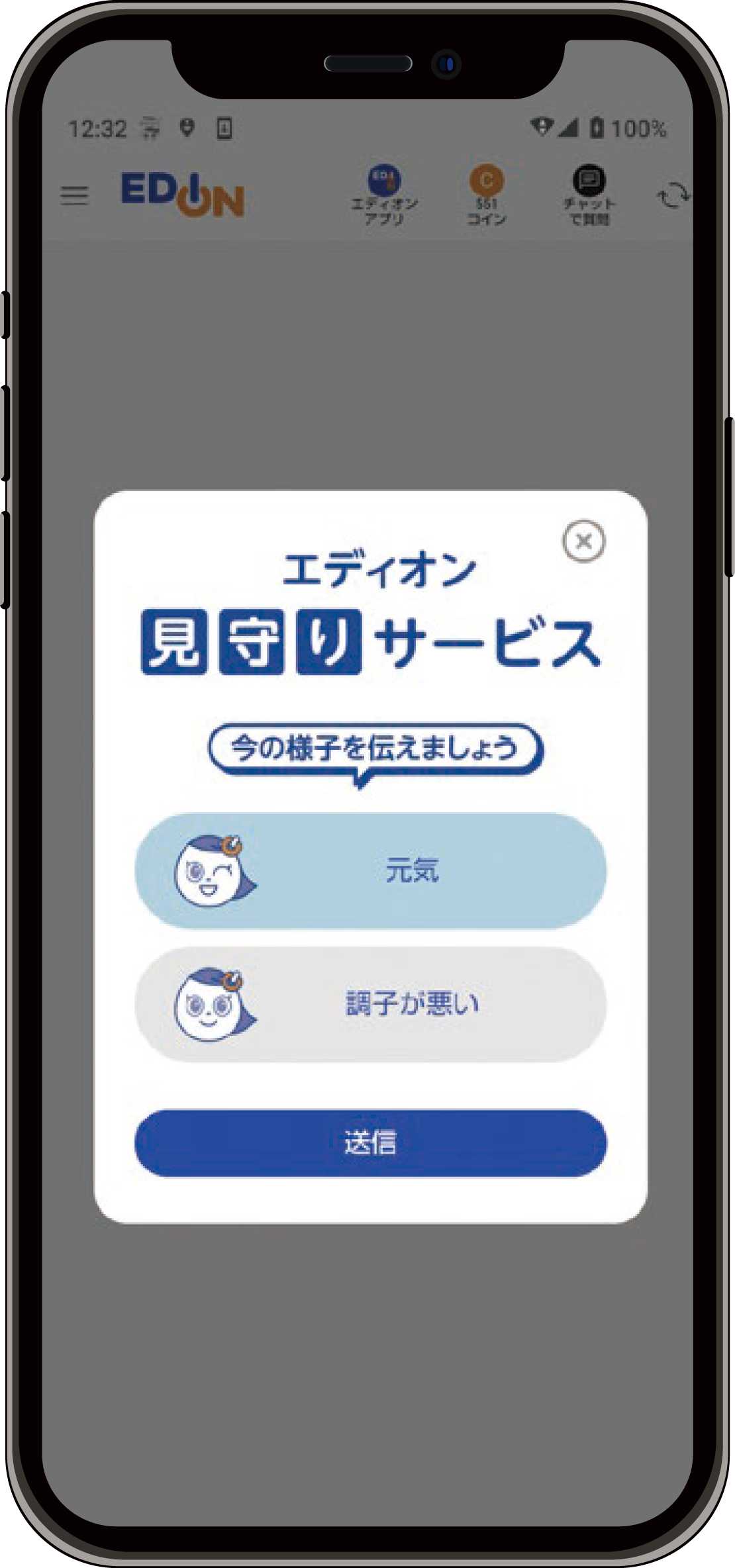 毎日ご自身で設定した時刻に通知が届き、アプリから「元気」か「調子が悪い」の2択を選ぶだけで健康報告が完了します。