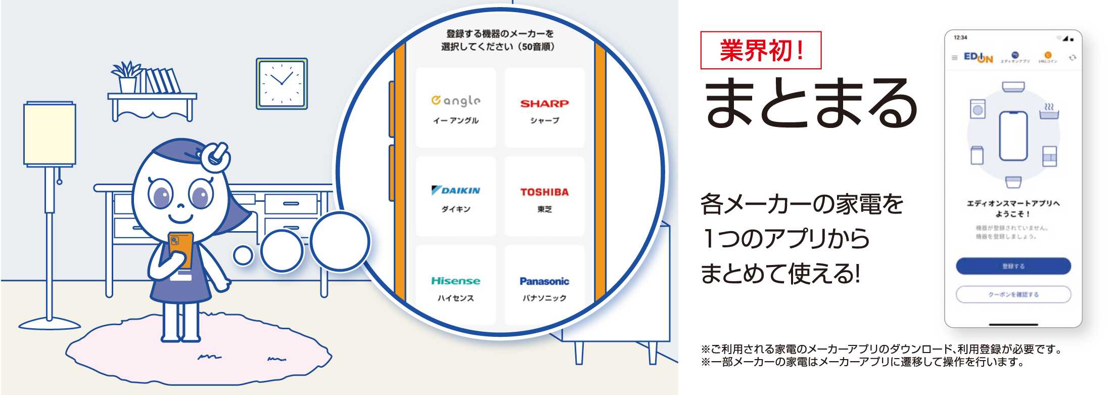『エディオンスマートアプリ』では、異なる機種・メーカーの家電をまとめて操作することができます。