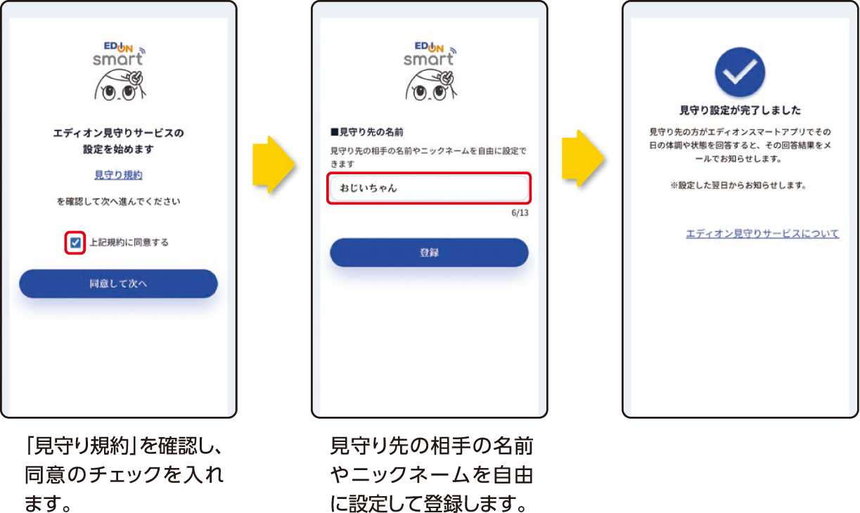 届いた「本登録のお願いメール」内のURLをクリックし、見守り先が判別できる名前(例えば、「おじいちゃん」など)を設定して登録ボタンを押すだけで、すぐに見守りを開始できます。