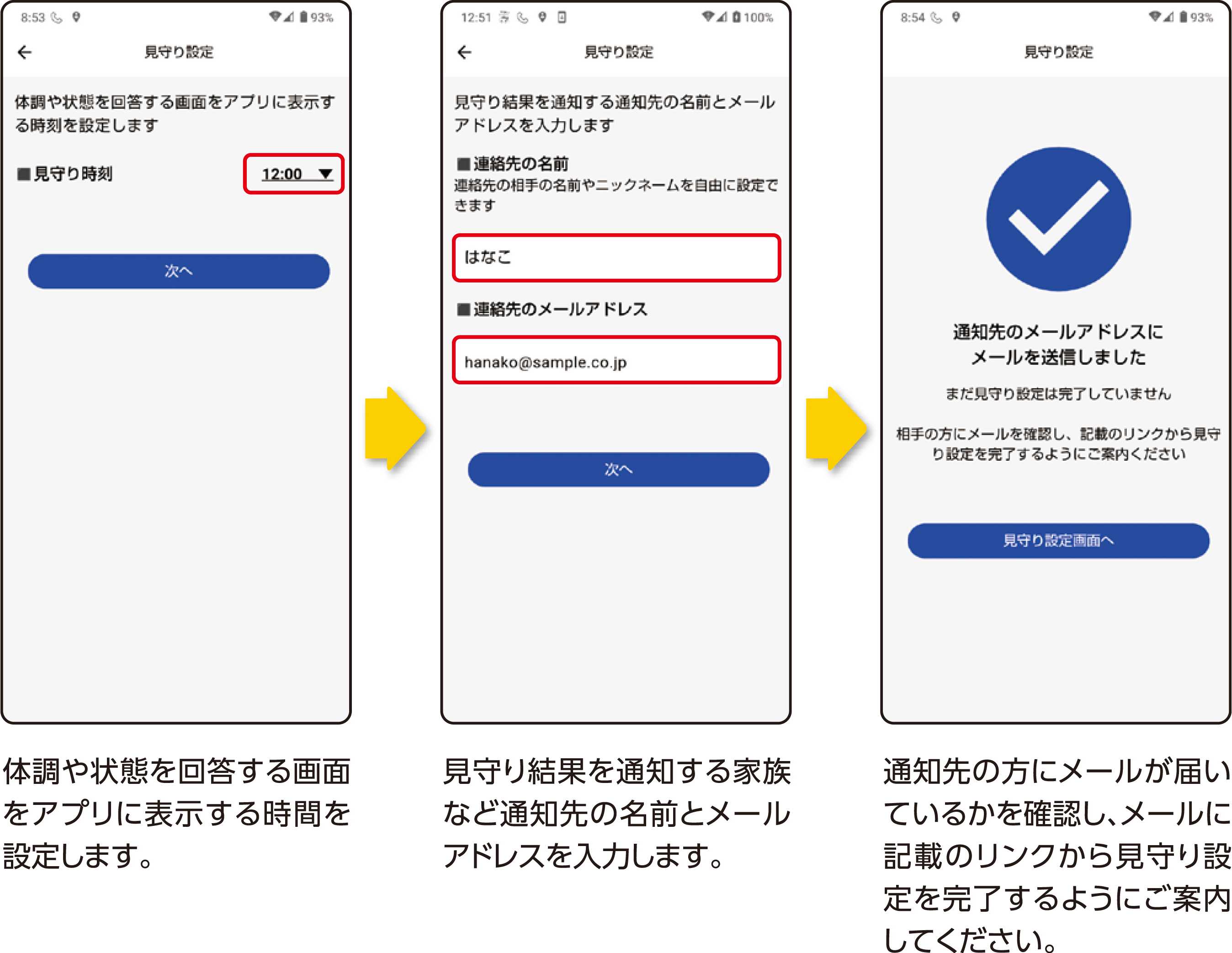 アプリ上で回答画面を表示する時刻を設定し、結果を共有したい(見守りメールを送信したい相手の)メールアドレスを登録するだけで完了します。(通知先は最大7件まで登録可能です)