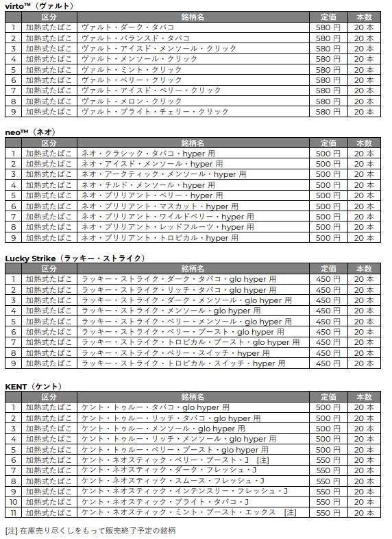 添付資料:加熱式たばこglo™(グロー)用スティック 小売定価一覧