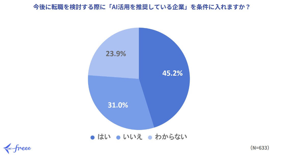 「今後転職を検討する際に『AI活用を推奨している企業』を条件に入れますか?」という質問に対し、半数近くの45.2%が「はい」と回答したことがわかりました。