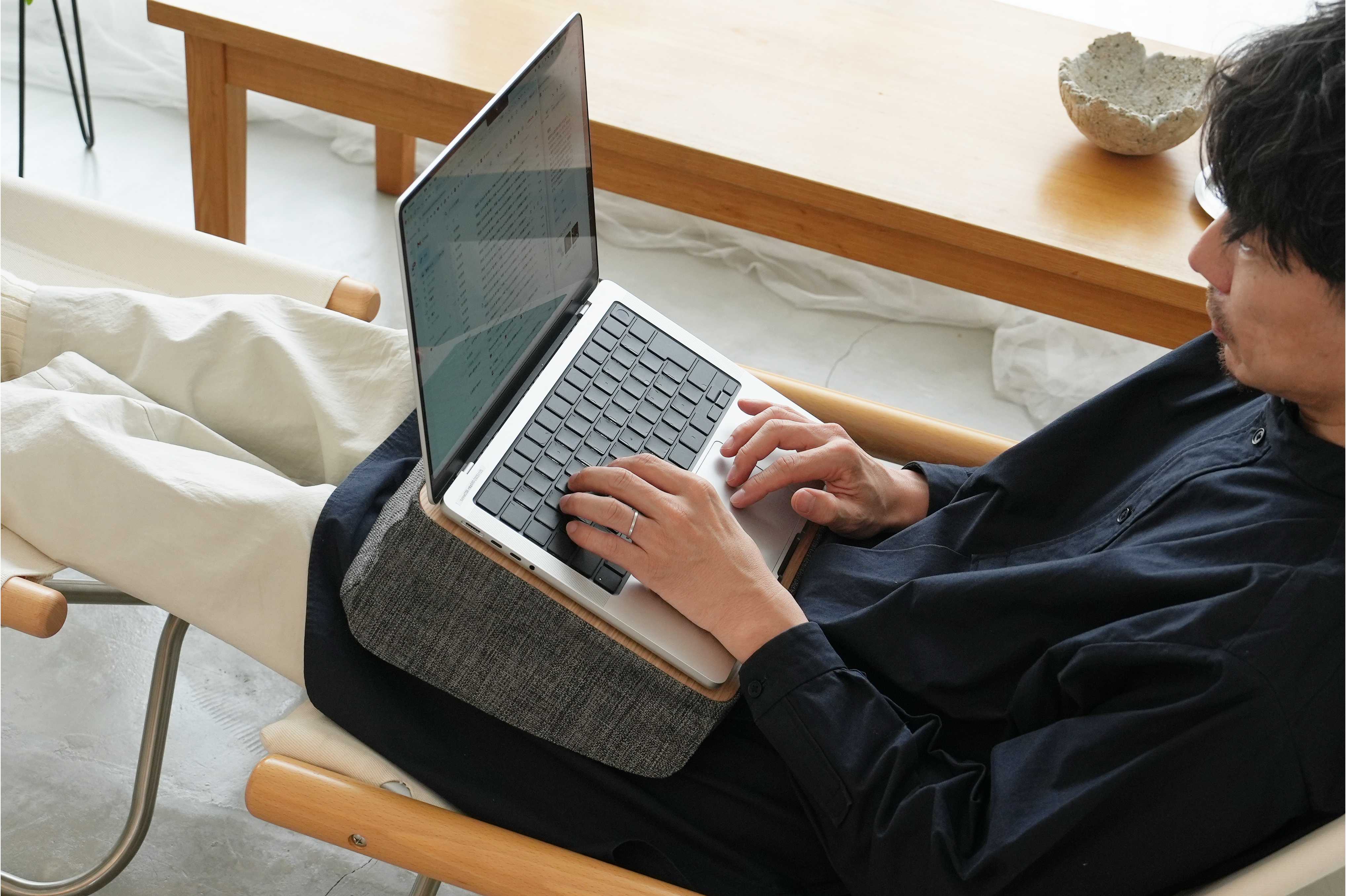 ソファやベッドなど、座れる場所があればどこでもご使用可能です。作業に適した高さ設計をしているため、リラックスした姿勢での作業環境をサポートします。天板には硬度の高いオークを採用し、PC作業に限らずメモを書留めたり、ペン作業にも対応します。