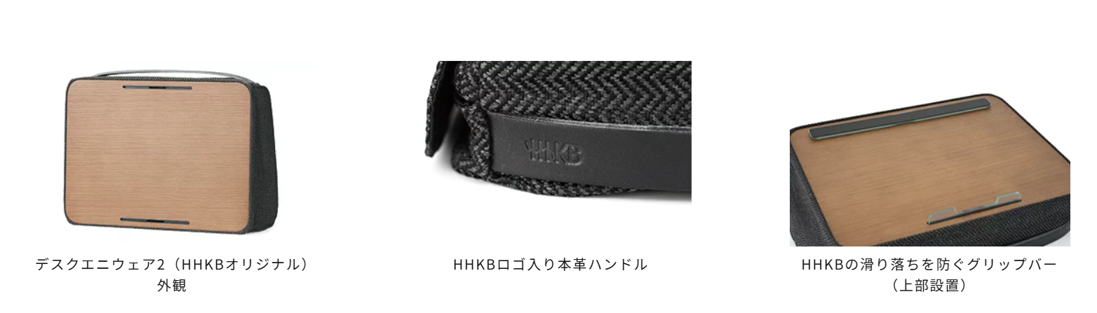 今回の連携により、ナチュラルカラーの通常モデルに加え、HHKBとそのユーザーの皆様への最適化を意図した「デスクエニウェア2(HHKBオリジナル)」をPFUダイレクト限定で発売します。ダークトーンのカラーリングとHHKBロゴ入りの本革ハンドルを採用しており、落ち着いた色合いがガジェットの佇まいをより引き立てます。