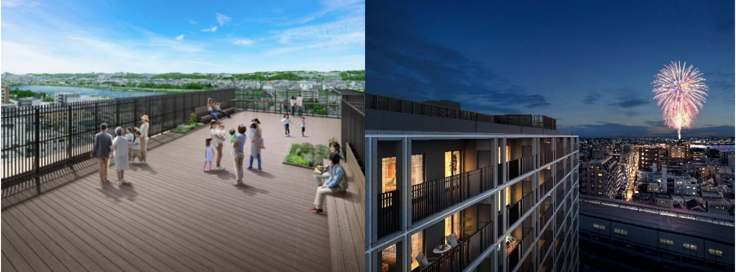 ≪(左)ルーフテラス・(右)建物外観と調布花火≫