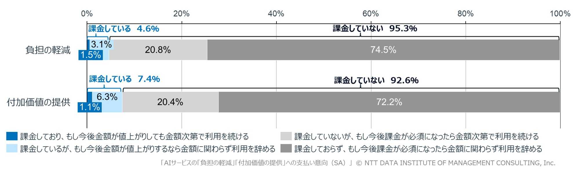 次にサービス利用時の価値を「負担の軽減」と「付加価値の提供」に分類し、課金状況および課金継続意向を分析しました。その結果、AIサービスで現在課金している人の割合は「負担の軽減」で4.6%、「付加価値の提供」で7.4%でした。
