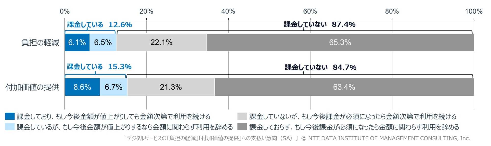 これに対し、デジタルサービスでは「負担の軽減」で12.6%、「付加価値の提供」で15.3%となり、付加価値を提供するサービスの課金意向が相対的に高い傾向がみられました(図表5)。