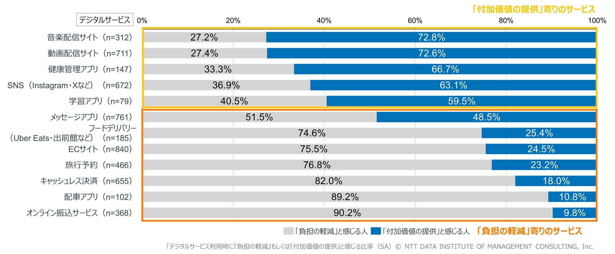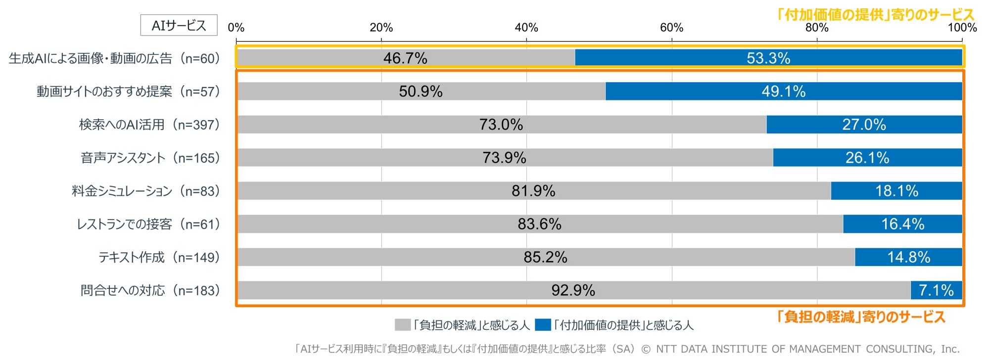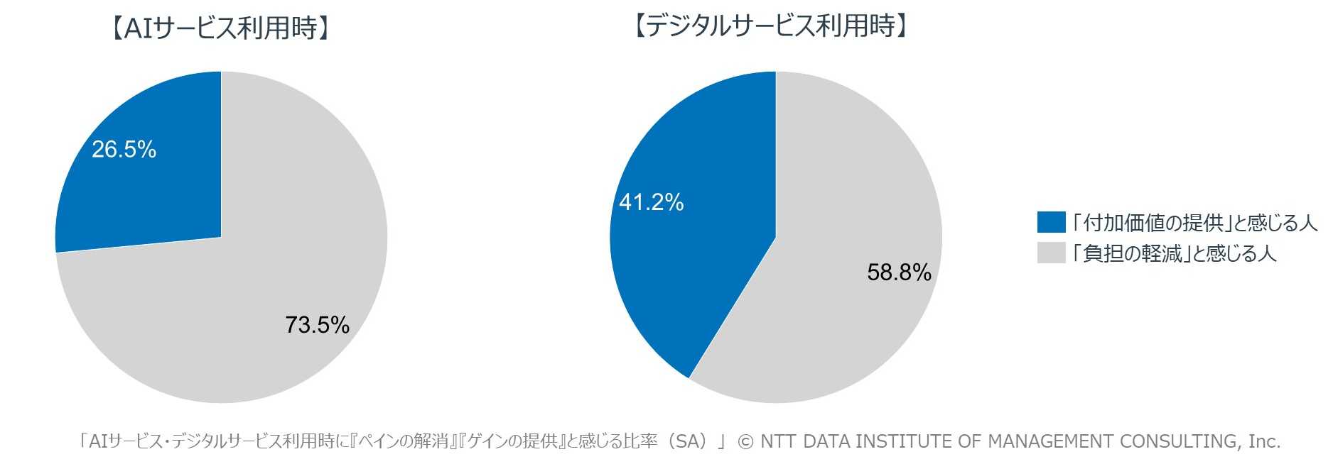 また、サービス利用時の価値を「負担の軽減」と「付加価値の提供」に分類して分析※2した結果、AIサービスでは「負担の軽減」に価値を感じる人が73.5%と多数を占め、「付加価値の提供」に価値を感じる人は26.5%にとどまりました。一方、デジタルサービスでは「負担の軽減」が58.8%、「付加価値の提供」が41.2%でした(図表1)。