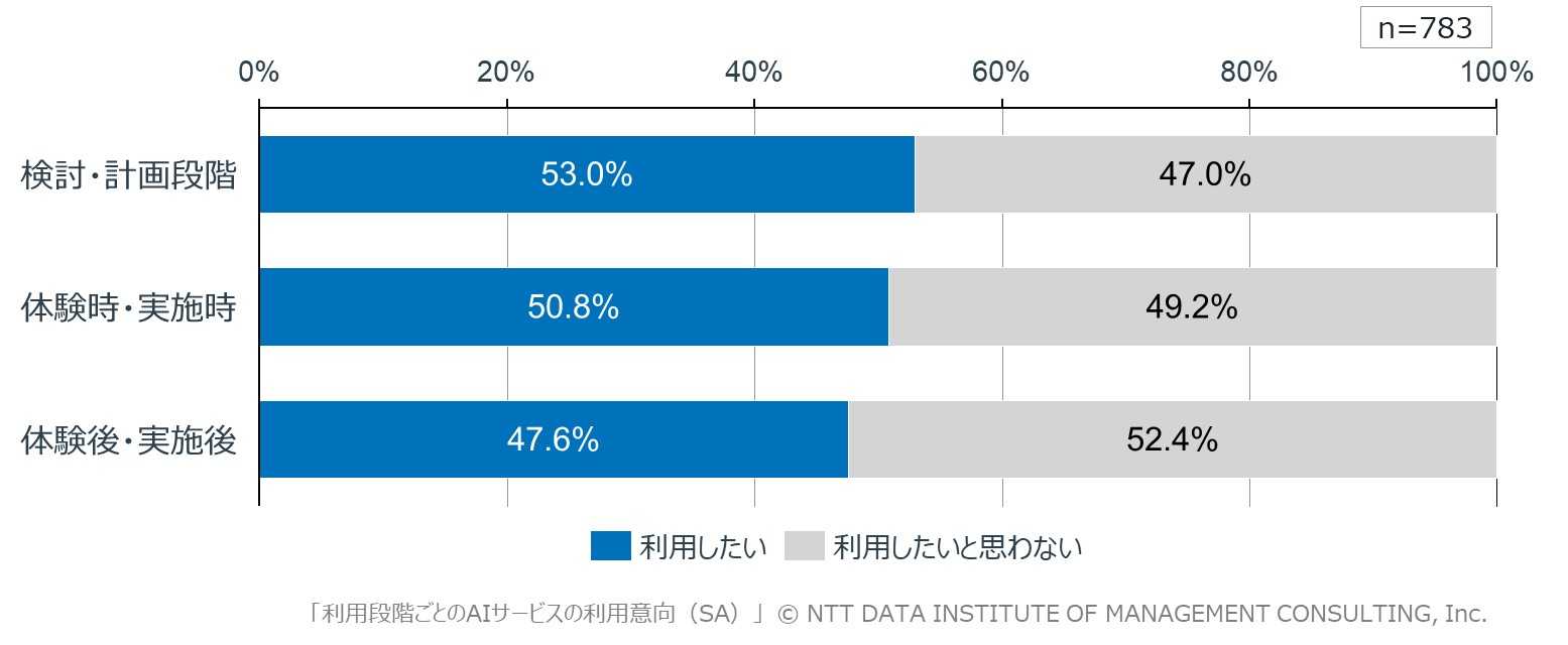 AIサービスの利用シーンを選択した回答者(n=783、「あてはまるものはない」と回答したn=259を除く)を対象に、重視する価値を満たすAIサービスに対する利用意向を調査した結果、「検討・計画段階」での利用意向が53.0%で最多となりました。AIサービスの設計においては、「体験時・実施時」の前の「検討・計画段階」に着目した付加価値の提供が重要であると考えられます(図表7)。