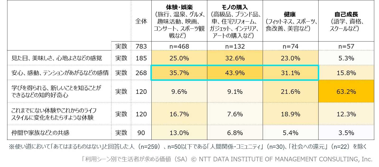 お金の使い道の上位3項目である「体験・娯楽」「モノの購入」「健康」の利用シーンで生活者が求める価値は、「安心、感動、テンションがあがるなどの感情」が最多でした。次いで、「見た目、美しさ、心地よさなどの感覚」が続きました。