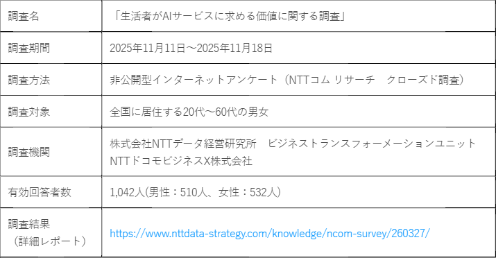 株式会社NTTデータ経営研究所(本社:東京都千代田区、代表取締役社長:山口 重樹、以下、当社)とNTTドコモビジネスX株式会社(本社:東京都品川区、代表取締役社長:稲葉 秀司)は、全国の20代~60代の男女1,042人を対象に「生活者がAIサービスに求める価値観に関する調査」を実施しました。