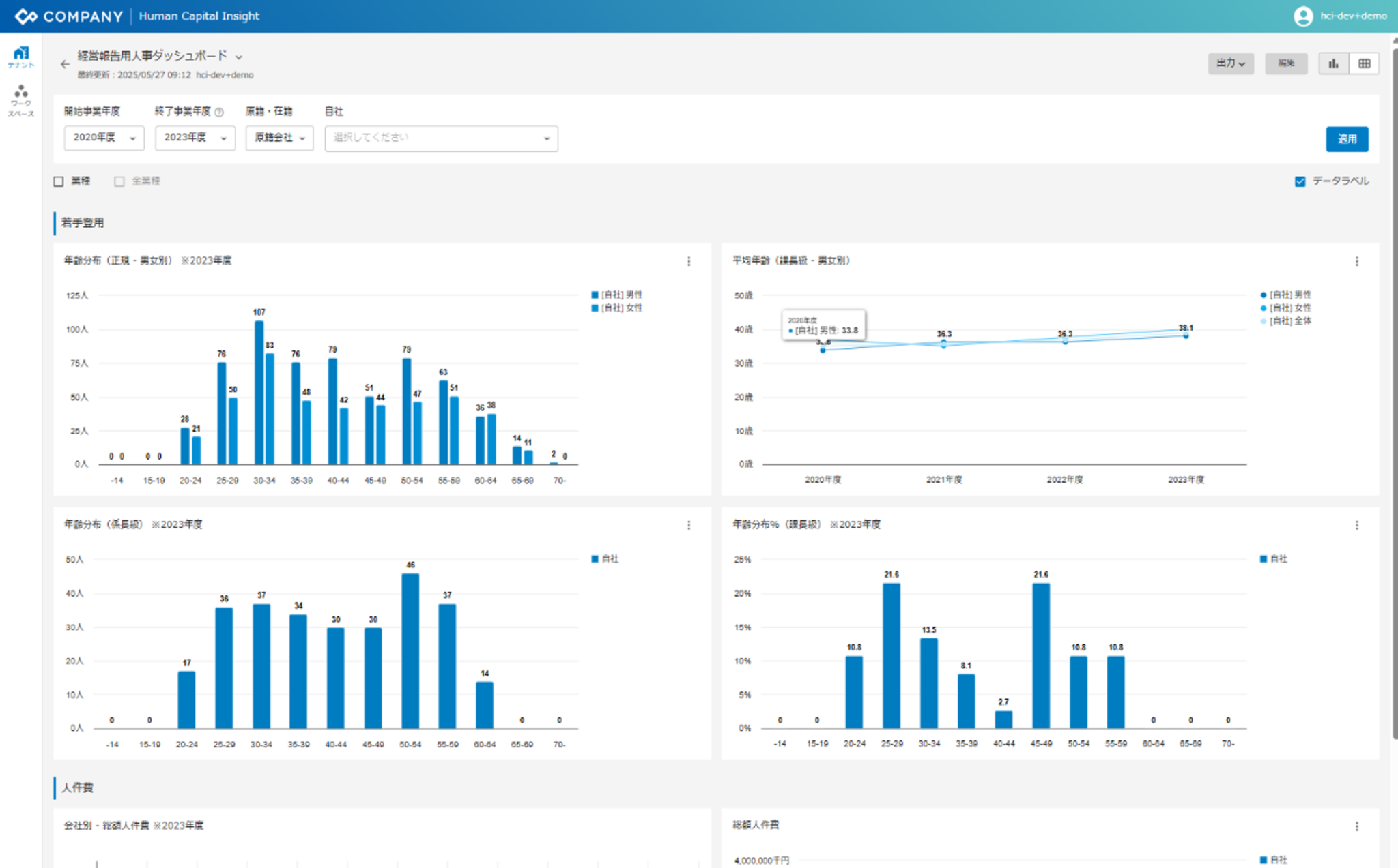経営戦略に基づく最適な人員配置の検討や、人的資本に関する情報開示を行う際、必要な人材データが様々なシステムや表計算ソフトに分散していたため、これまではその都度データの収集・加工に多大な工数を要し、正確な情報をすぐに得ることが難しい状態でした。人事基幹システムと一体化した「COMPANY®」のタレントマネジメントシステムも併せて利用することで、人事・給与・勤怠・評価などが同一データベースで管理されるため、データの加工や連携作業不要で、常に最新の人的資本データをリアルタイムで可視化・分析できるようになります。法令対応に必要な開示指標に加え、多様性や人材流動性(採用・離職など)に関する指標も、標準機能として実装されているため、即座にダッシュボード上へ表示できます。