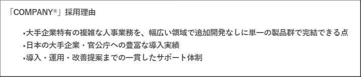 これら長年の課題を抜本的に解決するための新たなグループ統合人事システム基盤として、住友金属鉱山は「COMPANY®」の採用を決定しました。採用にあたっては、主に以下の点が評価されました。