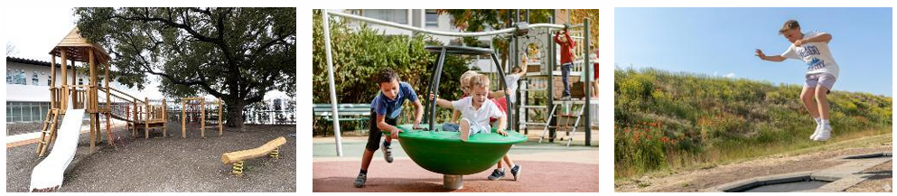自然の大きな木のふもとに、幅広い年齢の子どもが楽しめ、親子で挑戦ができる多彩な遊具を、計5種類設置しました。ジクホルツ社の木製複合遊具を中心に、立ちすわりで遊べる回転遊具やトランポリン「ジャンパー」などあそびながら多様なからだの動かし方を体験できます。
