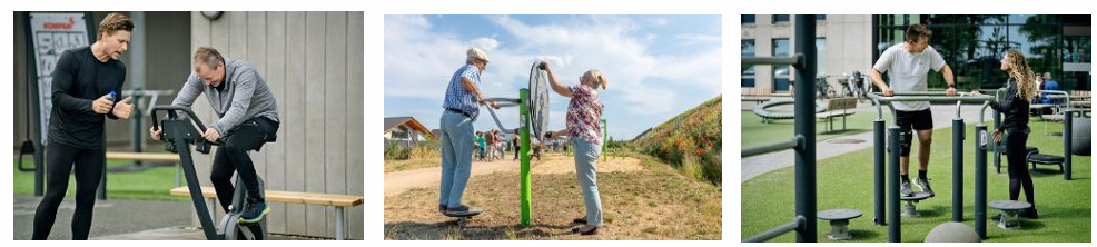 高齢者向けの健康維持や、親子が運動を楽しむことを目的に、地域の居場所として、デンマーク・コンパン社製の屋外フィットネス器具を5基設置しました。円盤を活用したストレッチ器具や、有酸素運動ができる自家発電型バイクなど、年齢や障がいの有無に関係なく、誰もが気軽にからだを動かし、体力や運動能力の向上ができる環境を工夫しました。