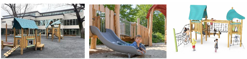「中央広場」「健康広場」「保育所の園庭」3つのエリアでボーネルンドが選定した遊具が導入されています。