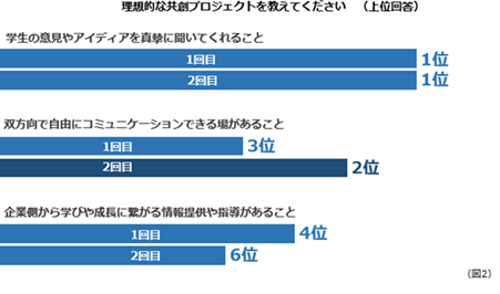 最後に「理想的な共創プロジェクト」に関する質問をしたところ、1回目と同様に「学生の意見やアイディアを真摯に聞いてくれること」がトップとなりました(図2)。一方で続く回答に変化が見られ、1回目で2位だった「挑戦の機会を与えてくれること」に代わり、2回目では「双方向で自由にコミュニケーションができること」が2位となりました(図2)。