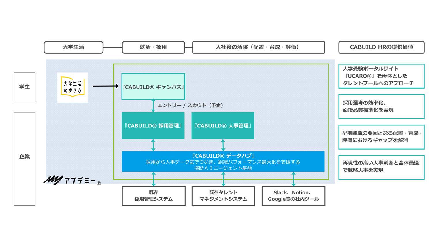 将来的には、当社が提供する自己主権型デジタルアイデンティティ基盤『アプデミー』とのデータ連携を計画しております。同基盤に蓄積された学生の学習履歴や体験実績を活用し、次世代のデジタル履歴書の生成サービスへの展開や、学生時代から連続的に蓄積される人的資本情報を活かすことで、企業の高度な経営判断を支える新たなサービスへと拡張してまいります。
