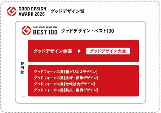 グッドデザイン賞は「グッドデザイン賞」と、特別賞の「グッドデザイン大賞」「グッドデザイン金賞」「グッドフォーカス賞」で構成されます。グッドデザイン賞受賞対象のうち、特に優れた100件が「グッドデザイン・ベスト100」として選出され、特別賞の候補となります。この100件から「グッドデザイン金賞」「グッドフォーカス賞」が選出され、さらに「グッドデザイン金賞」の中から最高賞である「グッドデザイン大賞」を決定します。