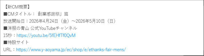 青山商事株式会社(本社:広島県福山市/代表取締役社長:遠藤 泰三)は、5月6日(水)に迎える「創業記念日」にあたり、日頃のご愛顧に感謝を込めて、2026年4月24日(金)から5月10日(日)まで、全国の「洋服の青山」および公式オンラインストアにて、最新のクールビズアイテムを特別価格で提供する「創業感謝祭」を開催いたします。