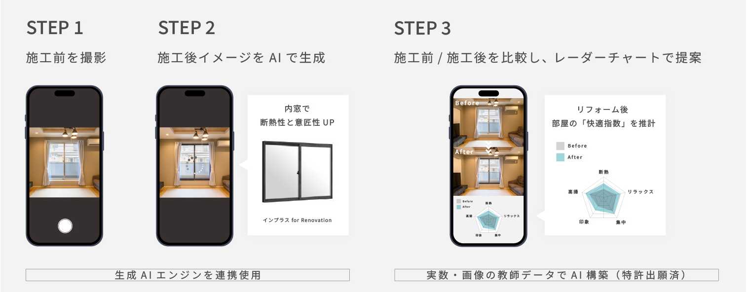 ユーザーがスマートフォンで既存の部屋を撮影するだけで、AIが改修後の部屋の画像を生成することに加え、AI解析モデルが断熱窓改修後のリラックス度や集中度などを予想し、レーダーチャートで変化を可視化します。改修前後の感情変化をシミュレーション比較し、「この窓に変えると、毎日がこれだけ心地よくなる」という、一人ひとりの感性に寄り添った納得感のある提案手法を確立します 。この解析は、サービス利用者の脳波を計測するのではなく、LIXILの体験型施設「住まいStudio(スタジオ)(https://www.lixil.co.jp/s/sumai_studio/
