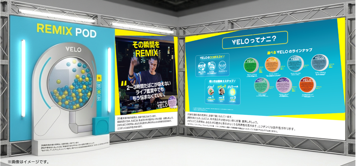 また、同ブースでは、VELOの最新キャンペーン「その瞬間をREMIX」をコンセプトにした「REMIX POD」も実施し、VELOを使いたくなる「MOMENT = 瞬間」にぴったりな景品をもれなくプレゼント※2 する施策も展開いたします。