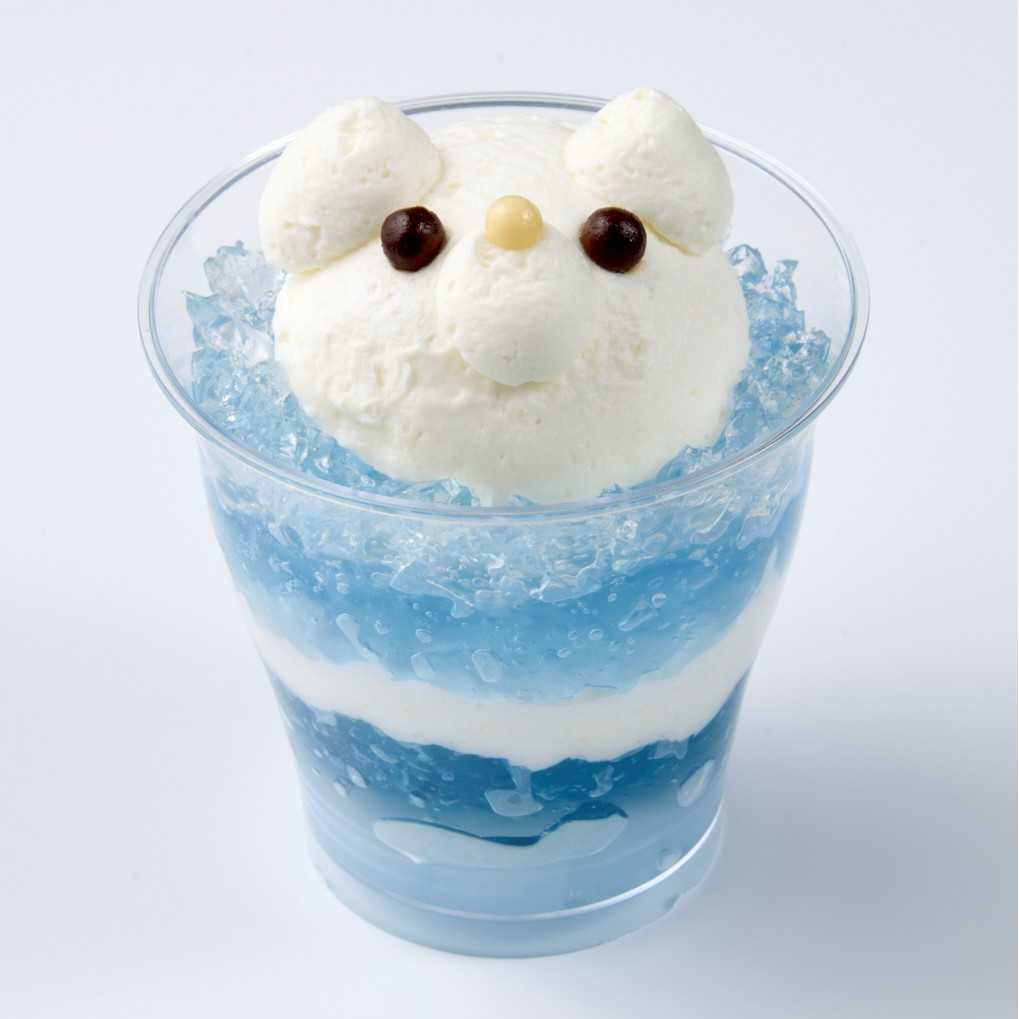 海から顔をひょっこりのぞかせているしろくまをイメージしたスイーツです。ほんのり甘い2種類の食感のソーダ風味ゼリーとヨーグルトクリームを組み合わせ、食感のアクセントにナタデココシロップ漬けを入れました。