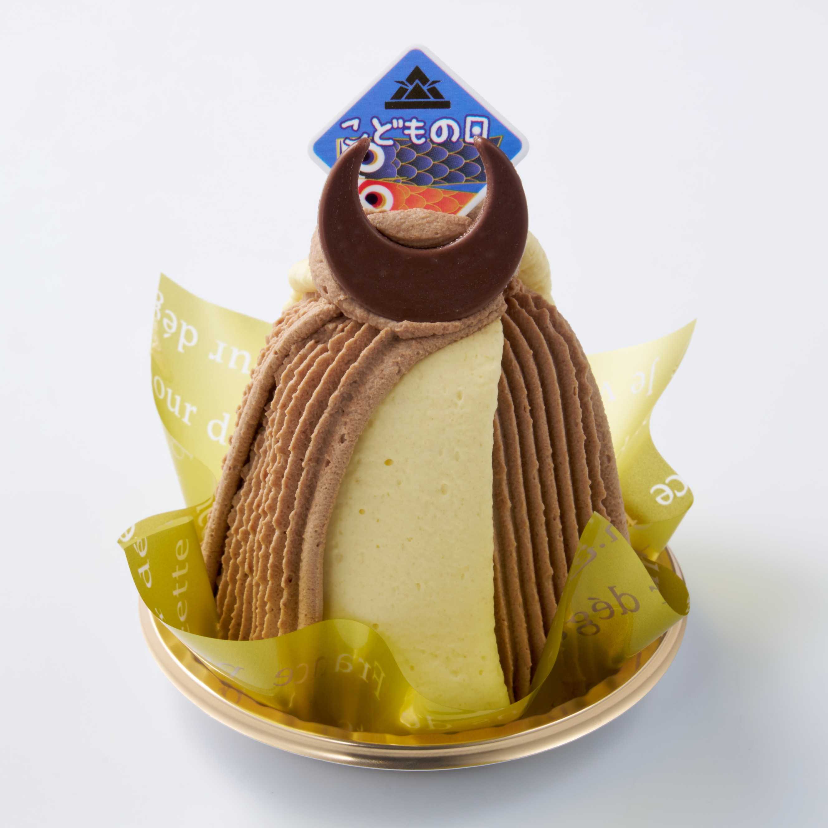 お子様に人気のチョコとバナナを組み合わせたモンブランです。芳醇な香りのバナナクリームと濃厚なチョコクリームをバランスよく重ね、中には食感のアクセントとして、サクッとしたシリアル入りチョコレートとマシュマロを入れました。かぶとをイメージし、チョコで作った三日月型の前立てを飾りました。