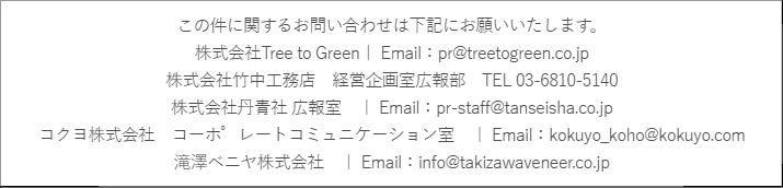 Tree to Green(本社:東京都渋谷区、代表取締役:青野 裕介)、ソルトターミナル(本社:長野県塩尻市、代表取締役:友保悟郎)、竹中工務店(本社:大阪市、社長:丁野成人)、丹青社(本社:東京都港区、代表取締役社長:小林統)の4社が設立した株式会社ツミカサネ(代表:青野裕介)に、コクヨ株式会社(本社:大阪市、社長:黒田英邦)、滝澤ベニヤ株式会社(本社:北海道芦別市、代表取締役:瀧澤貴弘)が新たに事業参加することになりました。