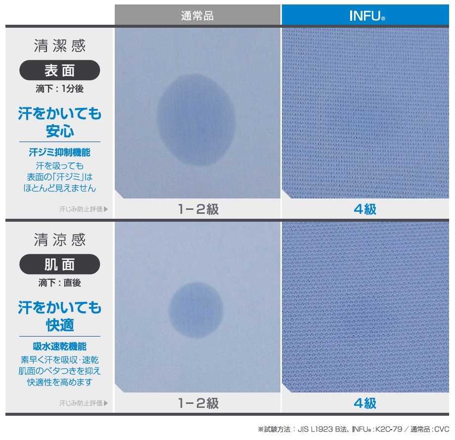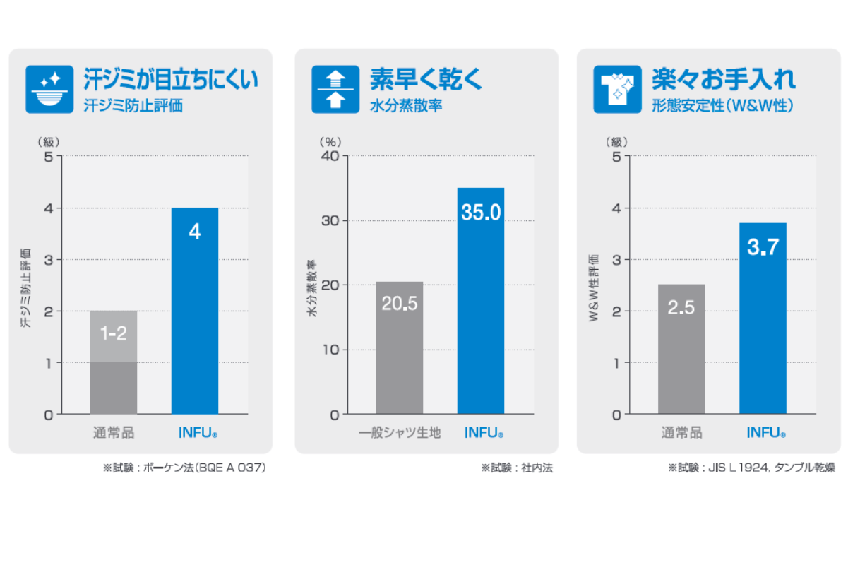 本企画は、特殊な糸を用い独自の編み方を採用した「INFU(インフ)」という生地を使用しています。同素材でできた生地と比べて2~4倍ほど汗ジミを抑制する効果があり、汗が目立ちやすいブルーのシャツでも清潔感のある見た目を維持できます。