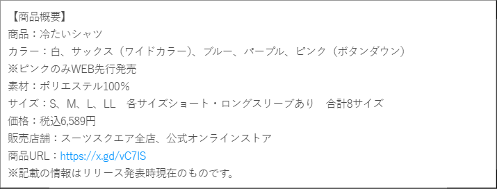 青山商事株式会社(本社:広島県福山市/代表取締役社長:遠藤 泰三)は、年々暑さが増す猛暑対策として、通常時だけでなく汗をかいた時により高い冷感効果を発揮する「冷たいシャツ」を4月27日(月)よりスーツスクエア全店および、公式オンラインストアにて発売します。