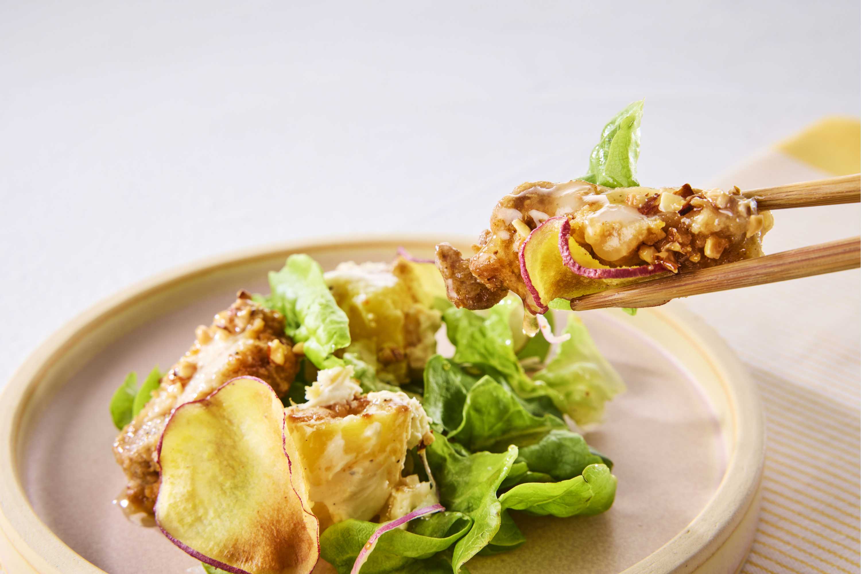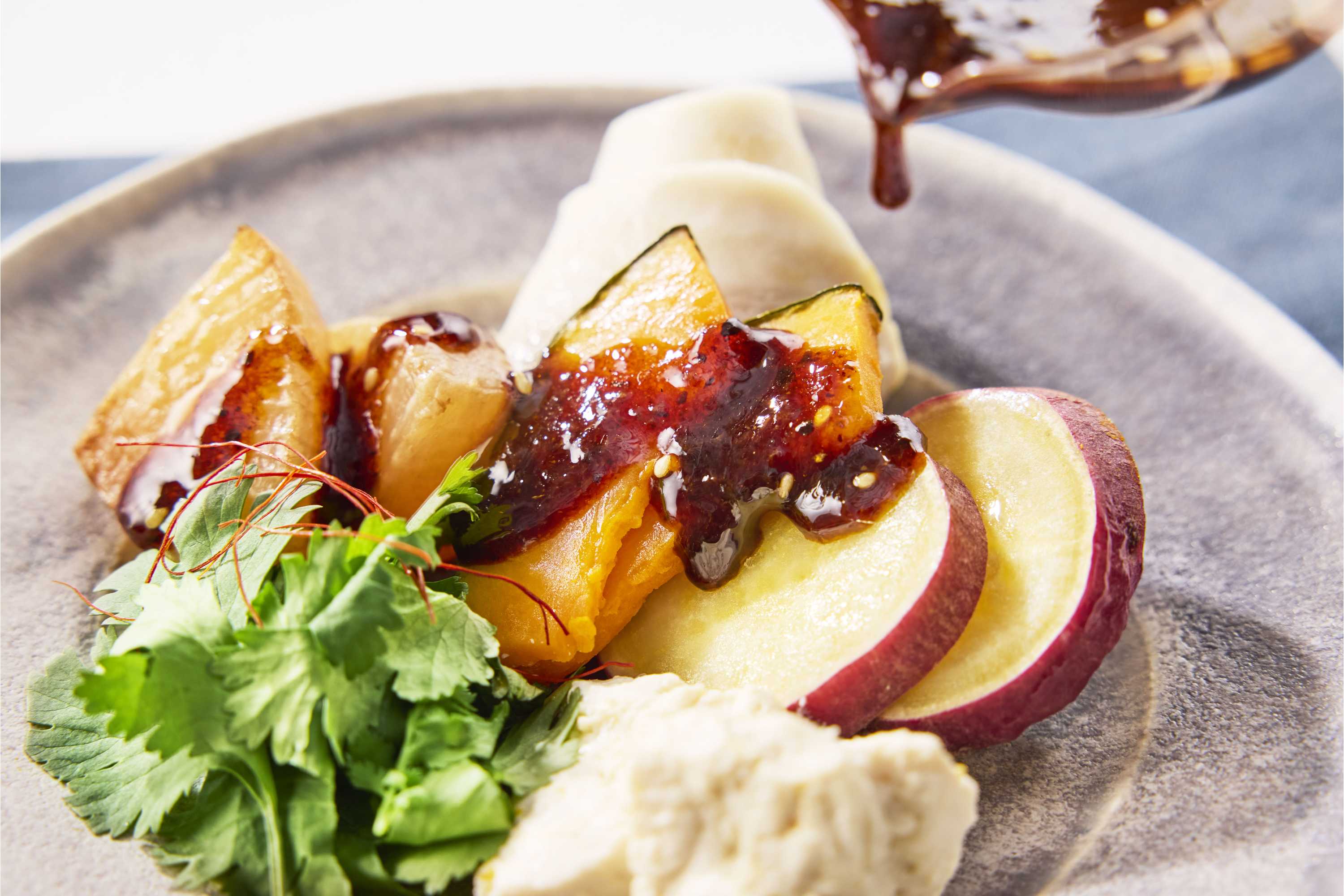 「噛む力に関係なく、誰もがおいしく野菜を楽しめるサラダを届けたい」という想いから、あえて“食感を消す”という逆転の発想で企画しました。蒸すことで引き出される素材の美味しさをシンプルに味わえるサラダです。塩漬けしてから蒸す、蒸した後に揚げるなど、野菜ごとに調理法を使い分けることで、味わいの広がりを持たせました。まずはそのまま素材の味を楽しみ、二口目からは融合自慢の豆鼓黒酢醤油ダレで召し上がっていただくのがおすすめです。