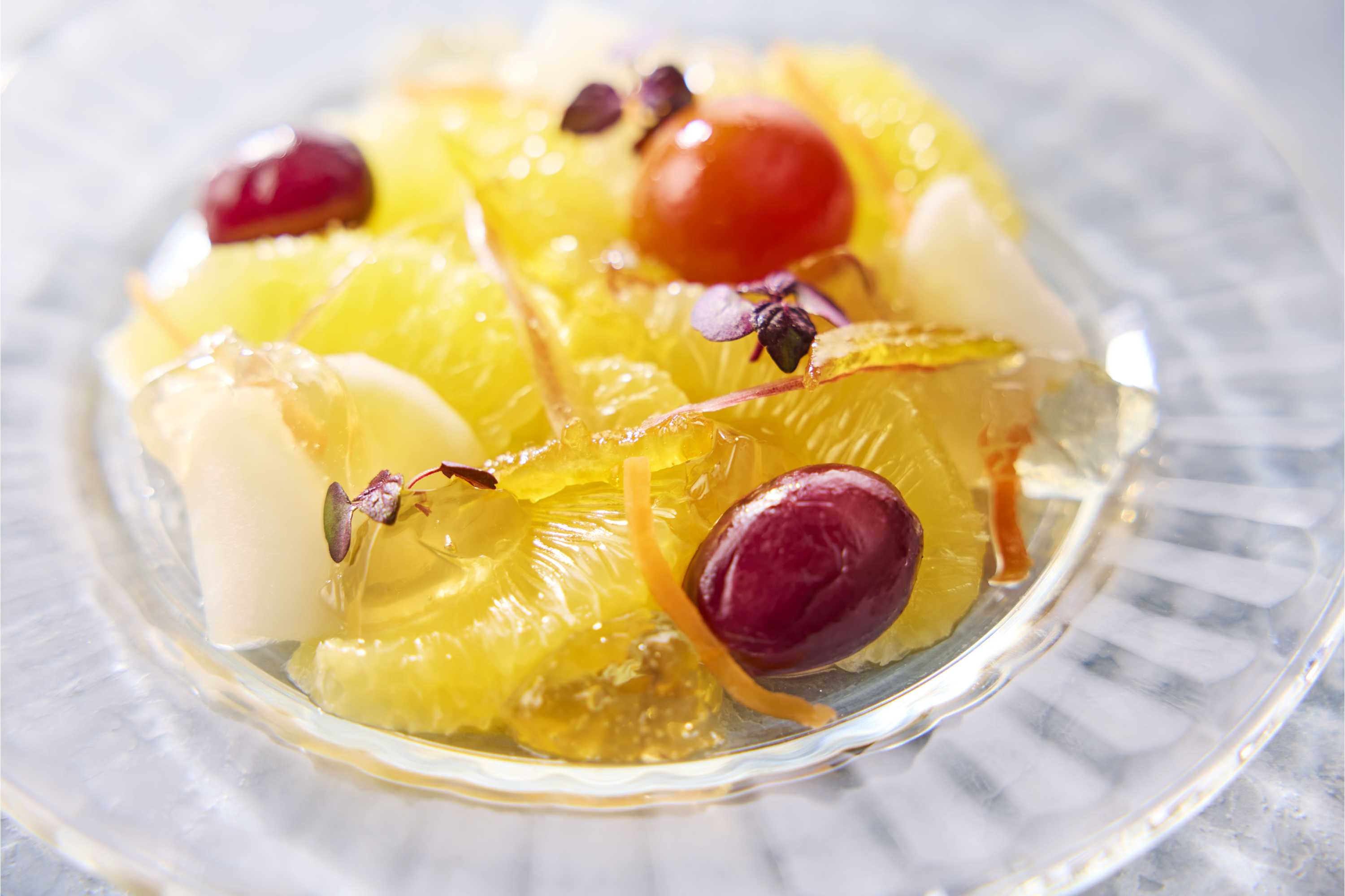 果肉をメインに、皮を使ったマーマレードを合わせ、素材をまるごと味わえます。柚子甘酢と合わせた人参、みょうが、こかぶなどの野菜、トマトやぶどうの浅漬けと一緒にお楽しみください。