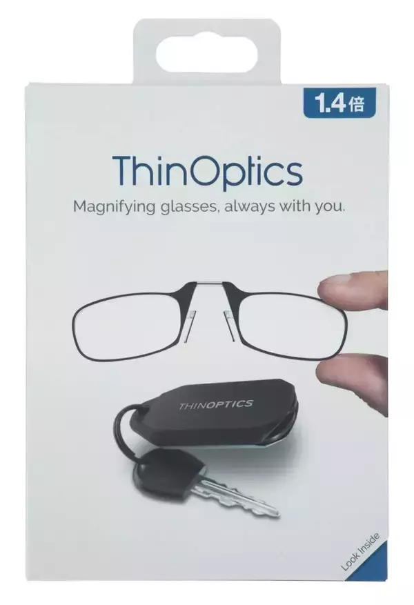 「Thin Optics」は、本体の厚さ2mm、重量4gと薄くて軽い、小鼻に挟むクリップタイプのメガネ型ルーペです。スマートフォンに貼り付けるタイプと、ケースに収納して鍵と一緒に持ち歩けるキーホルダータイプがあり、家でも外でも、ちょっとかけたい時にいつでも使える携帯性が特徴です。