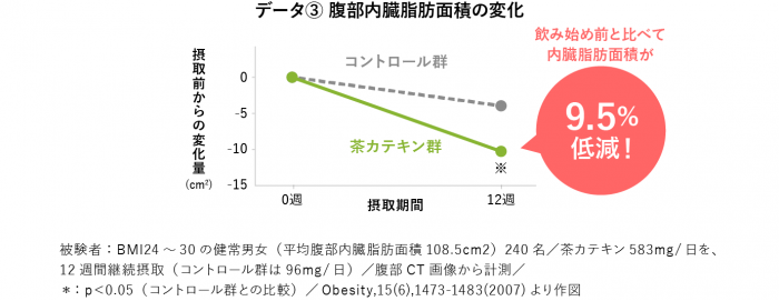 また、安静時に脂肪代謝量をアップさせる効果も確認されている(データ1)ほか、運動時の脂肪を代謝する力を高め(データ2)、エネルギーとして脂肪を消費し、内臓脂肪を減らすのを助けることもわかっている(データ3)ので、座っている時間が長くなり、エネルギー消費量が減ってしまいがちなテレワーク中には、茶カテキンを豊富に含んだ緑茶を飲むのがおすすめです。