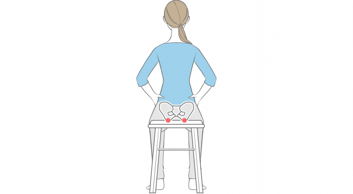 *「骨盤をまっすぐに立てる」イメージがわかりにくい場合は、両手を腰骨に当て、左右の坐骨を中心にして上体をゆらゆら揺らしてみます。坐骨が前にも後ろにもいかず垂直に体重がのったときが、「骨盤がまっすぐに立った」状態です。坐骨の左右どちらかに体重がかたよっていないか、頭の位置が骨盤より前にずれていないかも確認しましょう。