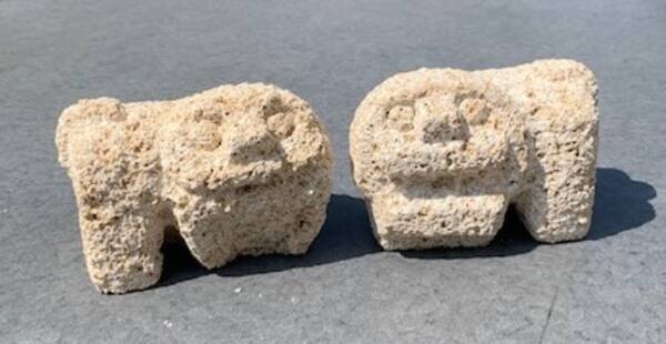 「スタジオde-jin」の石獅子は、ころっとしたフォルムで、なんとも和やかな雰囲気が見るものを楽しませてくれます。手彫りのため、一つとして同じものを作ることができないのも特徴です。