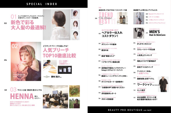 サロンワークの必需品であるヘアカラー剤からパーマ剤、ヘアケア用品、スキンケアやメイク、エステ・ネイル用品、シザー、大型機材・雑貨に加え、今回もサロンに役立つ特集を多数掲載。