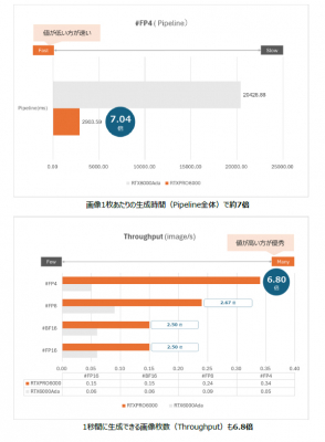 GitHub上で公開されているTensorRT 10.11デモ環境(Diffusion Pipeline)をベースにした当社環境での実行結果において、NVIDIA RTX(TM) 6000 Adaと比較して、画像1枚あたりの生成時間(Pipeline全体)で約7倍、1秒間に生成できる画像枚数(Throughput)も6.8倍の高速化を達成しました。Transformerを中心に大幅なレイテンシ削減が見られ、実用上の体感速度にも大きく貢献します。