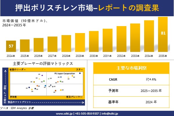 押出ポリスチレン市場に関する当社の調査レポートによると、押出ポリスチレン市場規模は 2035 年に約 81 億米ドルに達すると予想されています。さらに、2024 年の 押出ポリスチレン市場規模は約 57 億米ドルとなっています。押出ポリスチレン に関する市場調査レポートでは、市場は 2025-2035 年の予測期間中に約 4.6% の CAGR で成長するとも述べられています。