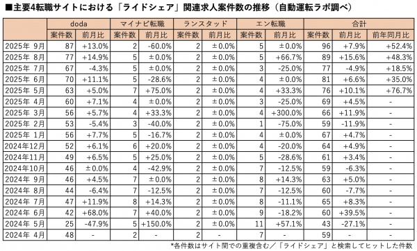 主要転職4サイトにおけるライドシェアの関連求人案件数(※「ライドシェア」と検索してヒットした求人)は2025年9月末時点で前月比7.9%増、前年同月比52.4%増の96件となりました。