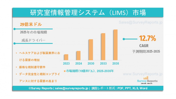 Surveyreportsのアナリストによる定性的なラボラトリー・インフォメーション・マネジメント・システム(LIMS)市場分析によれば、LIMS市場の規模拡大は、医療および製薬業界における需要の増加、厳格な法規制遵守要件、データ完全性およびコンプライアンスへの需要の高まり、自動化および運用効率向上の必要性といった要因によって促進されるとされている。
