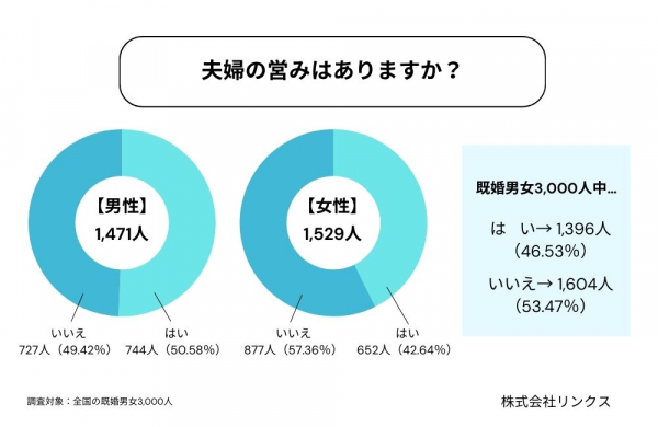 ・営みが「ない」と答えた人は全体の53.47%で、過去調査と同水準。