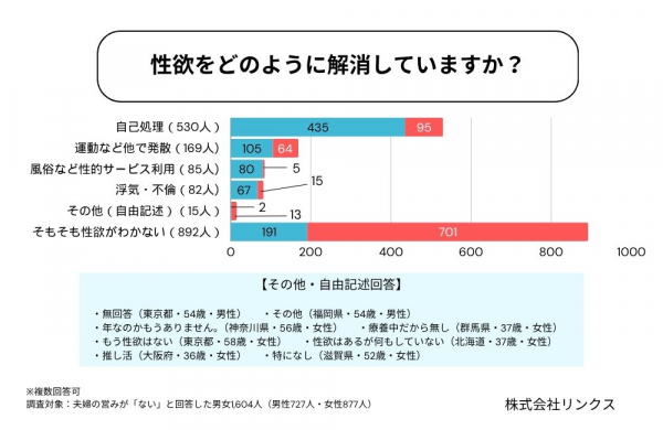 一方、男性は自己処理やサービス利用など、何らかの形で解消しようとする割合が高くなりました。
